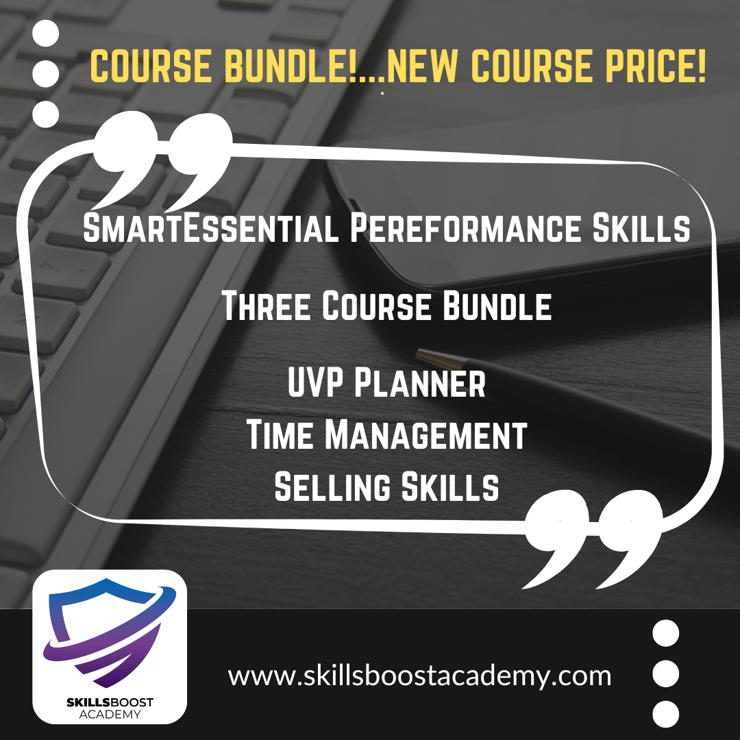 We’re excited to announce our new online course bundle at SkillsBoost Academy, bringing together our three most popular business skills improvement courses into one comprehensive package. The new bundle includes Smart Essential Selling Skills, Time Management, and the Unique Value Proposition Planner, all designed to help you elevate your business acumen and achieve success.